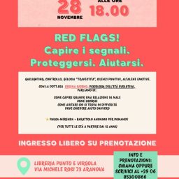 A talk on recognizing red flags in relationships, with psychologist Serena Iuorno. Real examples, a takeaway mini alphabet, and space for questions. Free event on November 28 at 6 PM, Libreria Punto e Virgola. For ages 12+.