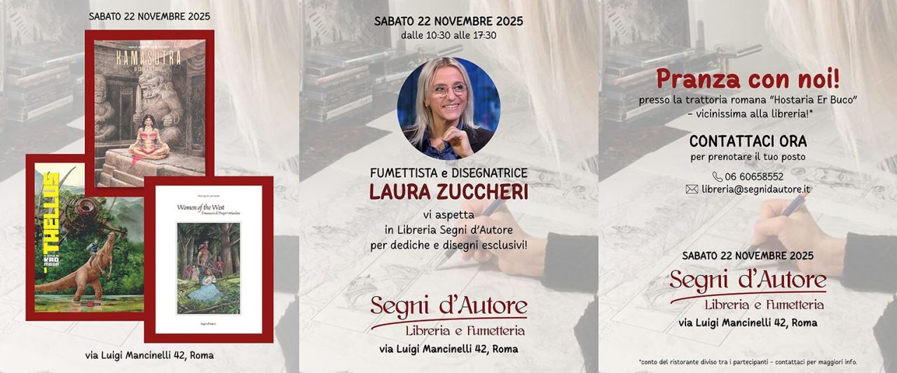 Sabato 22/11, sessione di dediche, con disegno, con Laura Zuccheri, sui volumi Il Massacro di Draper's Meadow (Edizioni Segni d'Autore) - Kamasutra (vincitore di un premio ai Lucca Comics Awards) e Thellus, il ciclo di Kad Moon (Alessandro EditorLibreria Segni d'Autore - Roma